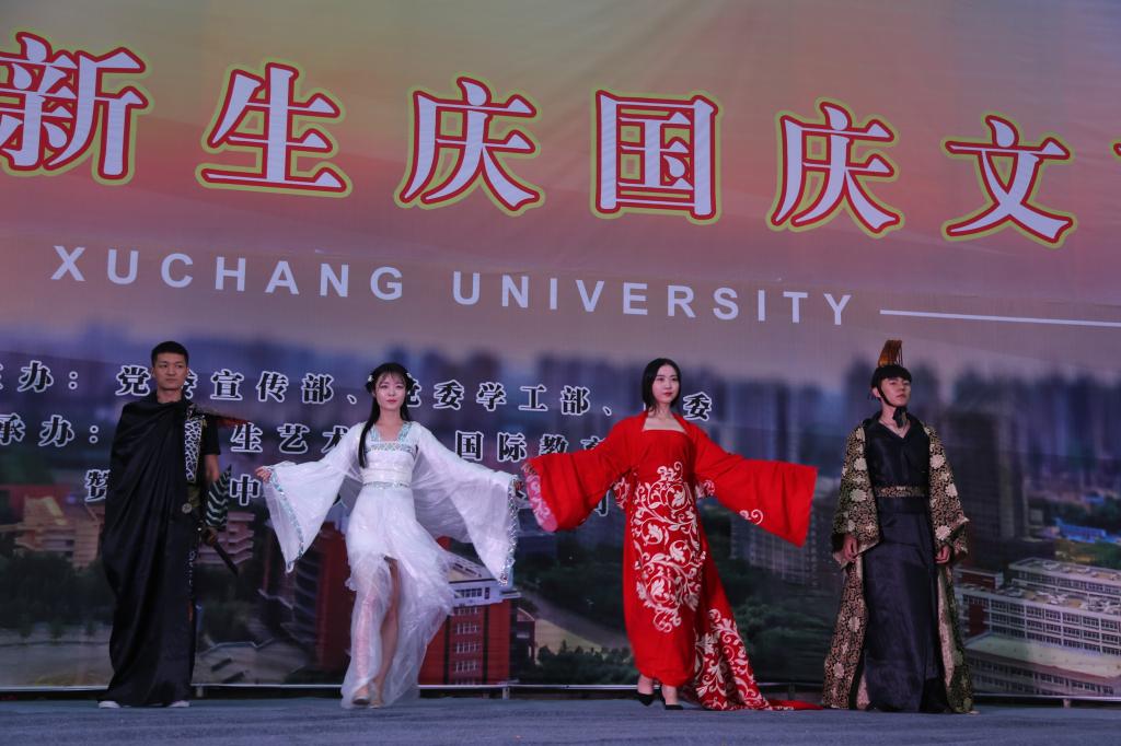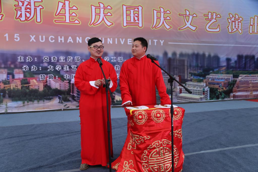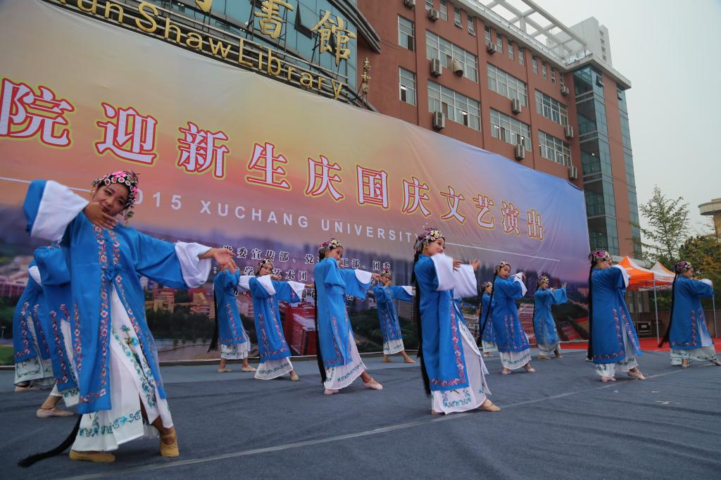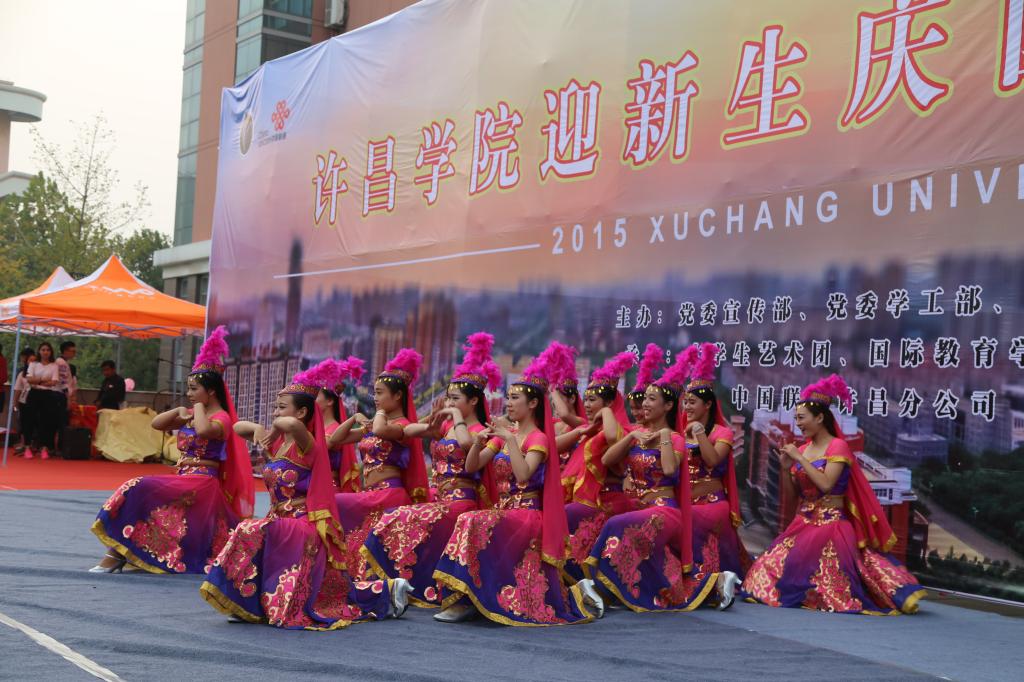 17点30分,在同学们绚丽多姿的民族舞《美丽的海娜花》中,演出正式开始。两个多小时的演出中,我校音乐舞蹈学院的师生和大学生艺术团、国际教育学院的同学们为2015级新生带来了《红旗飘飘》、《奔跑青春》、《青衣》、《映山红》、《亲吻祖国》等格调高雅,精彩纷呈的文艺节目,演出现场我校校友董珂和许昌电视台节目主持人首元还为观众带来的他们精心创作的相声段子,晚会在百余名同学铿锵合颂的《许昌学院赋》中圆满结束。现场气氛非常热烈,多才多艺的师生把爱国情操和美好祝福唱到了师生心田。