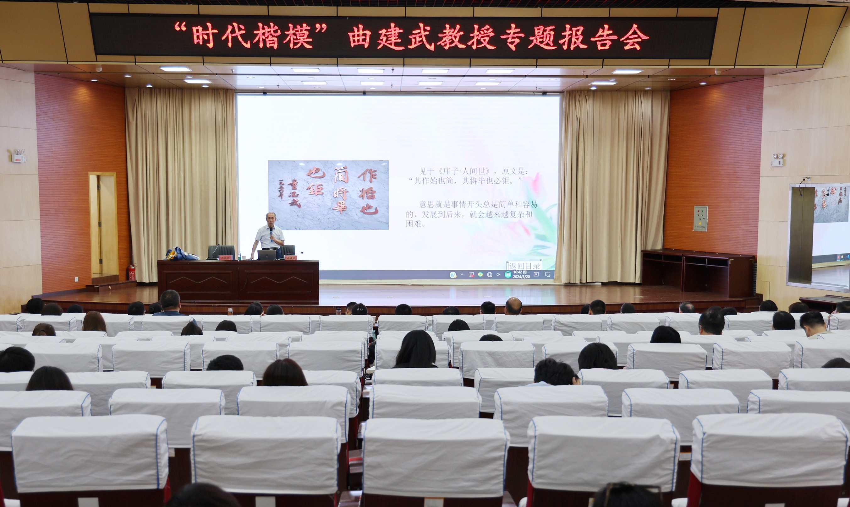 5月20日,“时代楷模”“最美奋斗者”“全国道德模范”“万人计划教学名师”“全国优秀教师”,大连海事大学马克思主义学院二级教授、博士生导师曲建武教授应邀来到我校,分别为我校师生作《做好大学生人生成长的指导者和引路人》《涵养崇高师德 倾力铸魂育人》专题报告。学校600余名师生参加报告会。