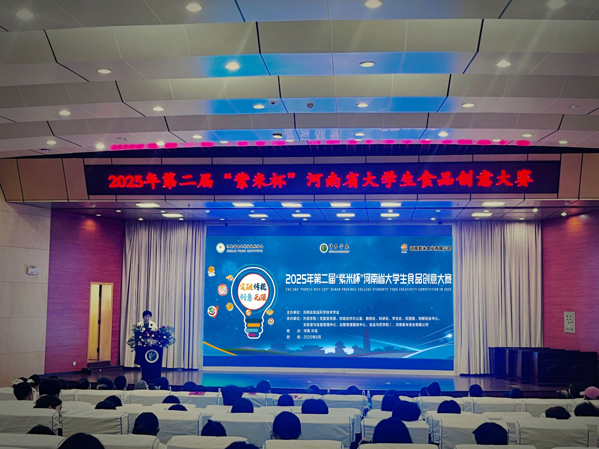 6月13日,由许昌学院和河南省食品科学技术学会、河南紫米食业有限公司共同举办的2025年第二届“紫米杯”河南省大学生食品创意大赛成功举办。许昌学院副校长赵艳敏、河南省食品科学技术学会副理事长、秘书长王瑞国、河南紫米食业有限公司董事长王志磊出席活动。来自全省24所高校的博士研究生、硕士研究生、本科生和专科生共计83支队伍参加比赛。