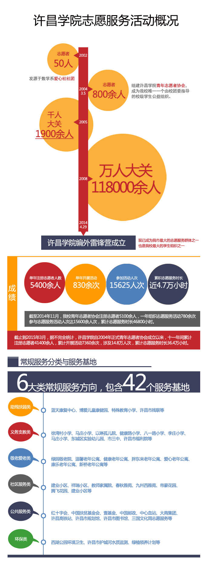 据不完全统计,自2004年至今十一年间,我校累计注册志愿者41400余人,累计开展活动7360余次,涉及14.8万人次,累计志愿服务时长36.4万小时。