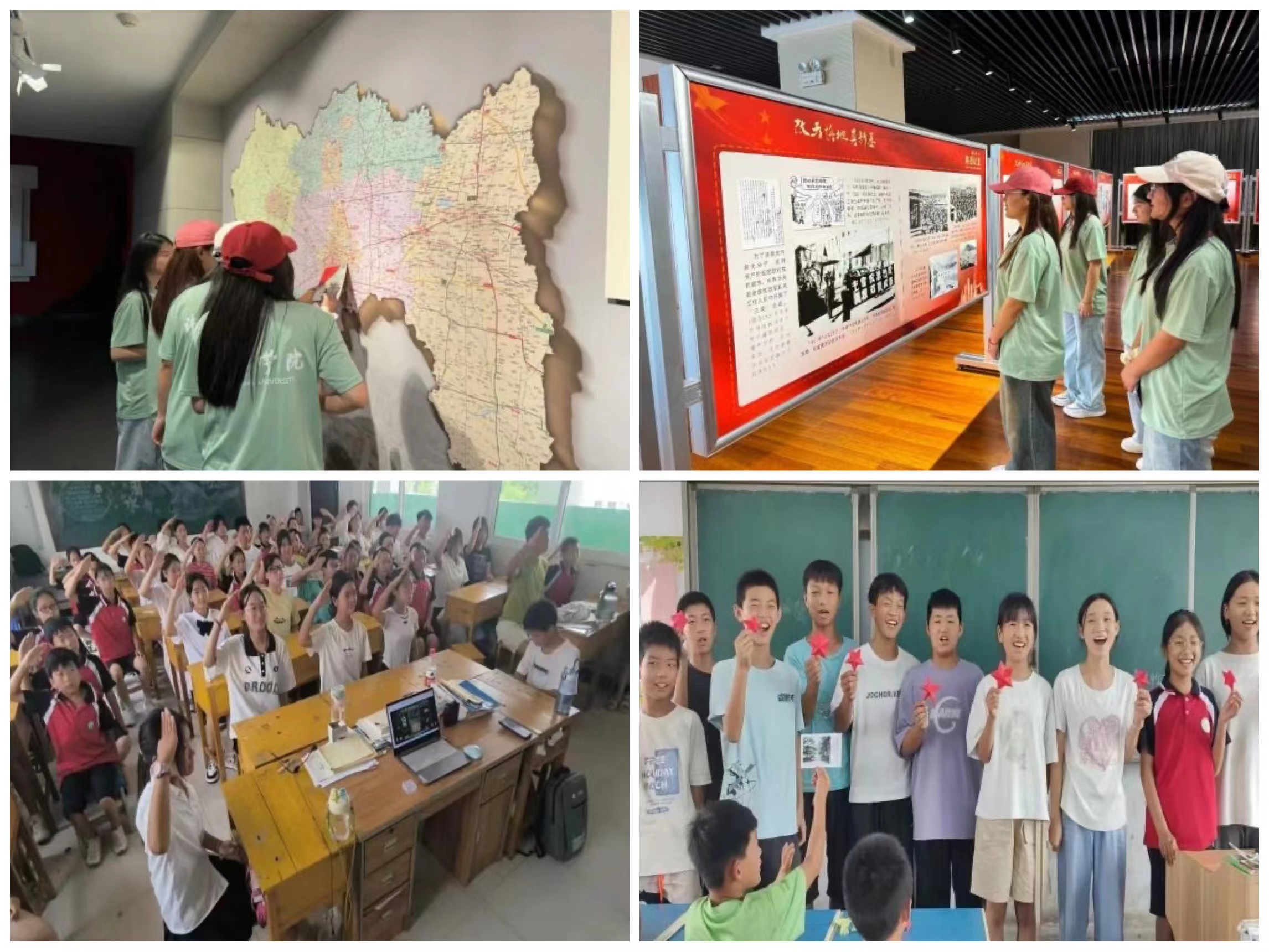 外国语学院“学思践悟新思想,笃行不怠启新程”暑期实践队赴许昌烈士陵园,向纪念碑致敬并参观革命历史纪念馆。队员们深受先烈事迹感染,决心铭记历史,传承红色基因,为实现中国梦不懈奋斗。教育学院“青年说中华”宣讲团围绕“两弹一星”精神,开展系列寓教于乐的社会实践活动。通过“功勋之光”绘本宣讲、红星折纸、红歌合唱等活动,激发青少年爱国爱党情怀,丰富校园文化,在孩子们心中播撒爱国种子,立志成为时代新人。