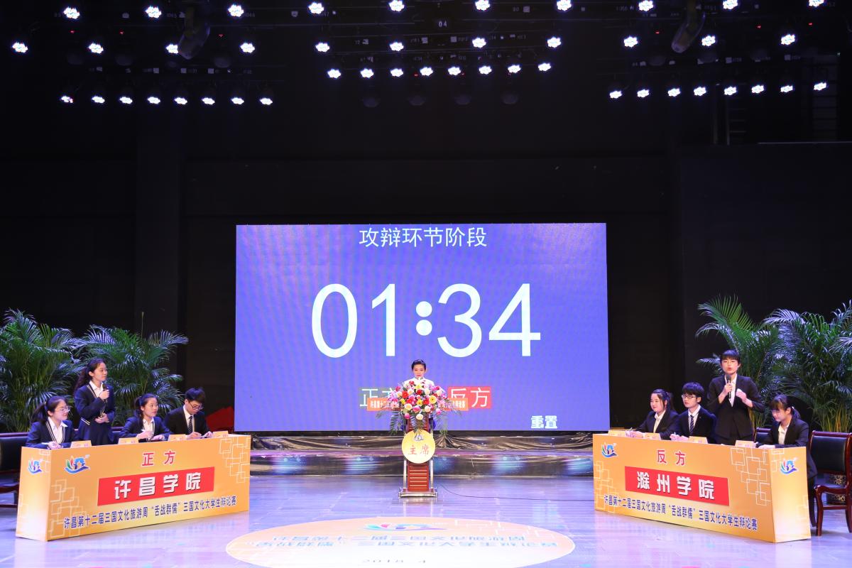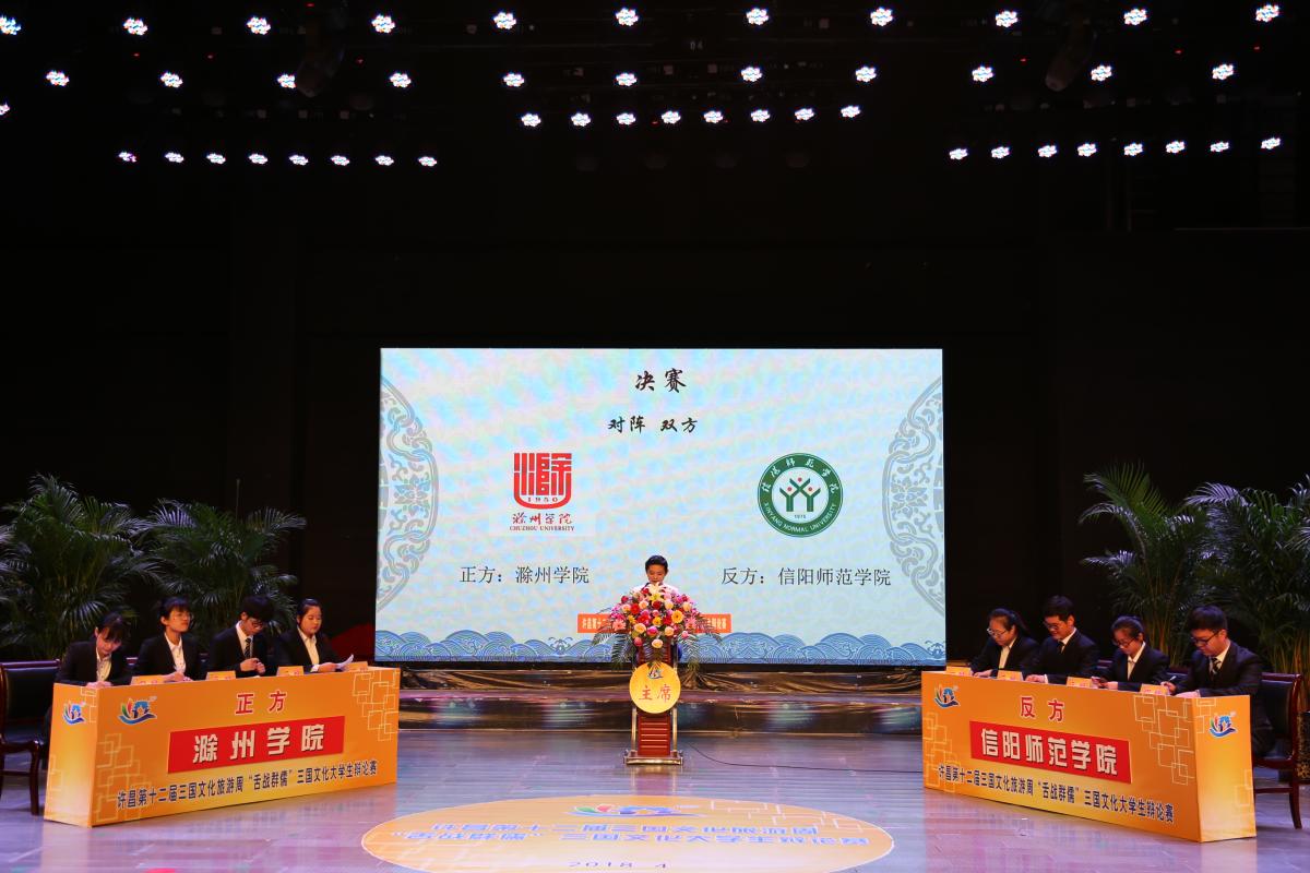 4月29日晚,由许昌市人民政府主办,许昌学院、许昌广播电视台承办的许昌第十二届三国文化旅游周“舌战群儒”大学生辩论赛在许昌电视台演播大厅圆满落幕。经过激烈角逐,最终滁州学院代表队获得冠军,信阳师范学院代表队屈居亚军,长江大学及许昌学院代表队并列季军。市人大常委会副主任艾祥涛、许昌学院党委副书记孙海,许昌广播电视台党委书记、台长李海彬等领导和许昌市民、学院师生等一同观看了此次辩论赛。