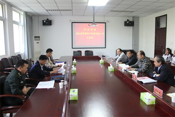 会上,崔斌副院长代表学校对军事训练调研督查组一行的到来表示热烈欢迎。他从学生军事训练工作组织领导及规章制度建立情况、学校军事教学机构及师资配备情况、落实教学大纲情况、军事理论课开设情况、学生军事训练经费和教学保障情况、安全防范事故情况和开展学校国防教育活动情况、开展在校学生的人民防空教育情况、军训及国防教育工作面临的主要困难等八个方面向调研督查组汇报了我校的国防教育和学生军训工作。他说,我校党委、校行政高度重视学生的国防教育和军事训练工作,每年都把新生国防教育及军训工作作为必修课来安排,在省教育厅体卫艺处军训办公室的具体指导下,我校的国防教育和军训工作开展扎实有效。目前新生军训工作正在有序推进,在教官的指导下,学生已初步掌握了一些军事技能和军事理论知识,加强了团结协作能力,提高了组织纪律性,树立了集体主义思想,增强了国防观念和国家安全意识。