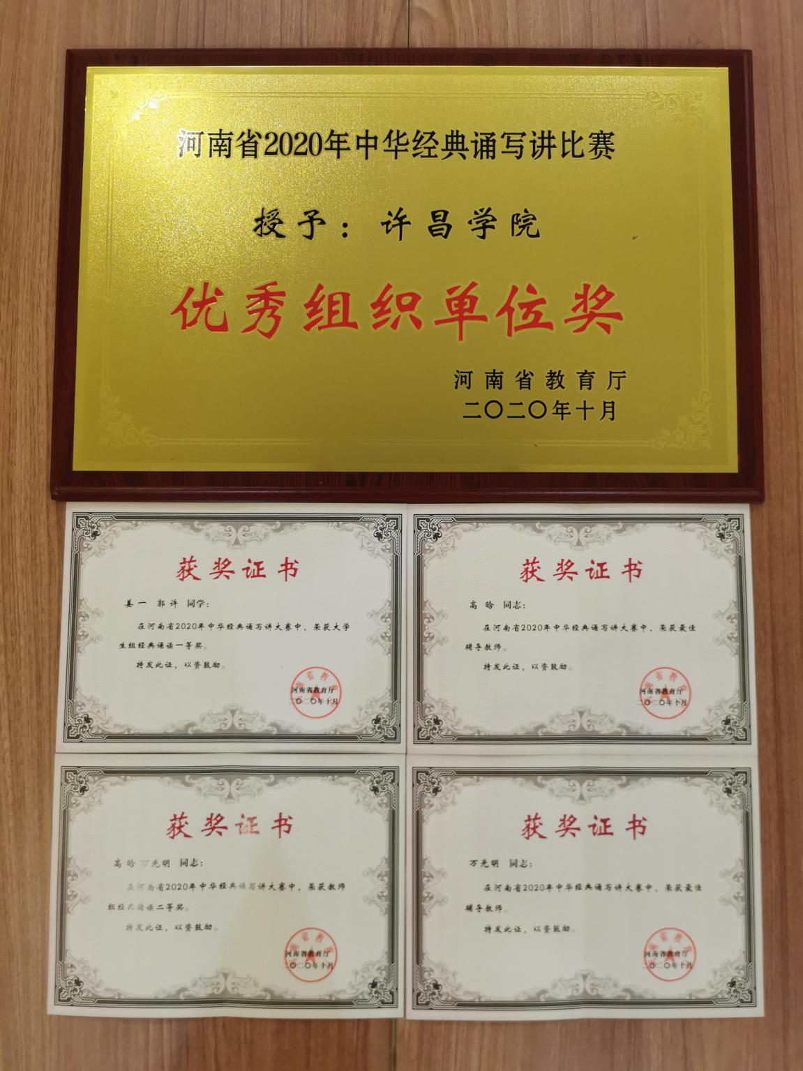 近日,河南省教育厅公布了河南省第二届中华经典诵写讲大赛“诵读中国”经典诵读大赛评选结果,我校选送的两个作品获得一等奖、二等奖,我校获得优秀组织奖。