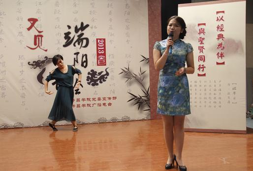 春夏代序,艾草飘香。为弘扬传统文化,发扬爱国精神,纪念伟大的爱国诗人屈原,由许昌学院党委宣传部主办的2013年“又见端阳”弘扬传统文化诗会于6月11日晚在B合七演播厅隆重举行。校党委宣传部部长潘春彩、副部长崔越,许昌交通广播主持人王雪冰等与现场一百余位观众一起观看了诗会。